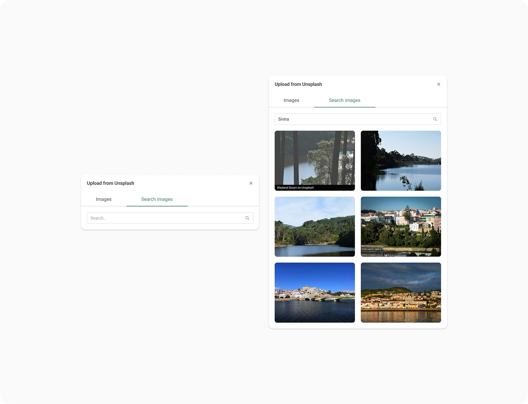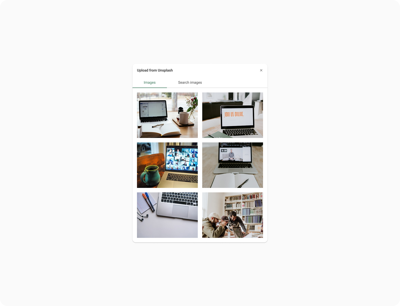Once selected, users are presented with a modal that defaults to a context-aware query. For example, creating an event surfaces a curated Unsplash feed related to events. Users can also switch tabs to search freely within the Unsplash library, ensuring flexibility without overwhelming first-time users.
