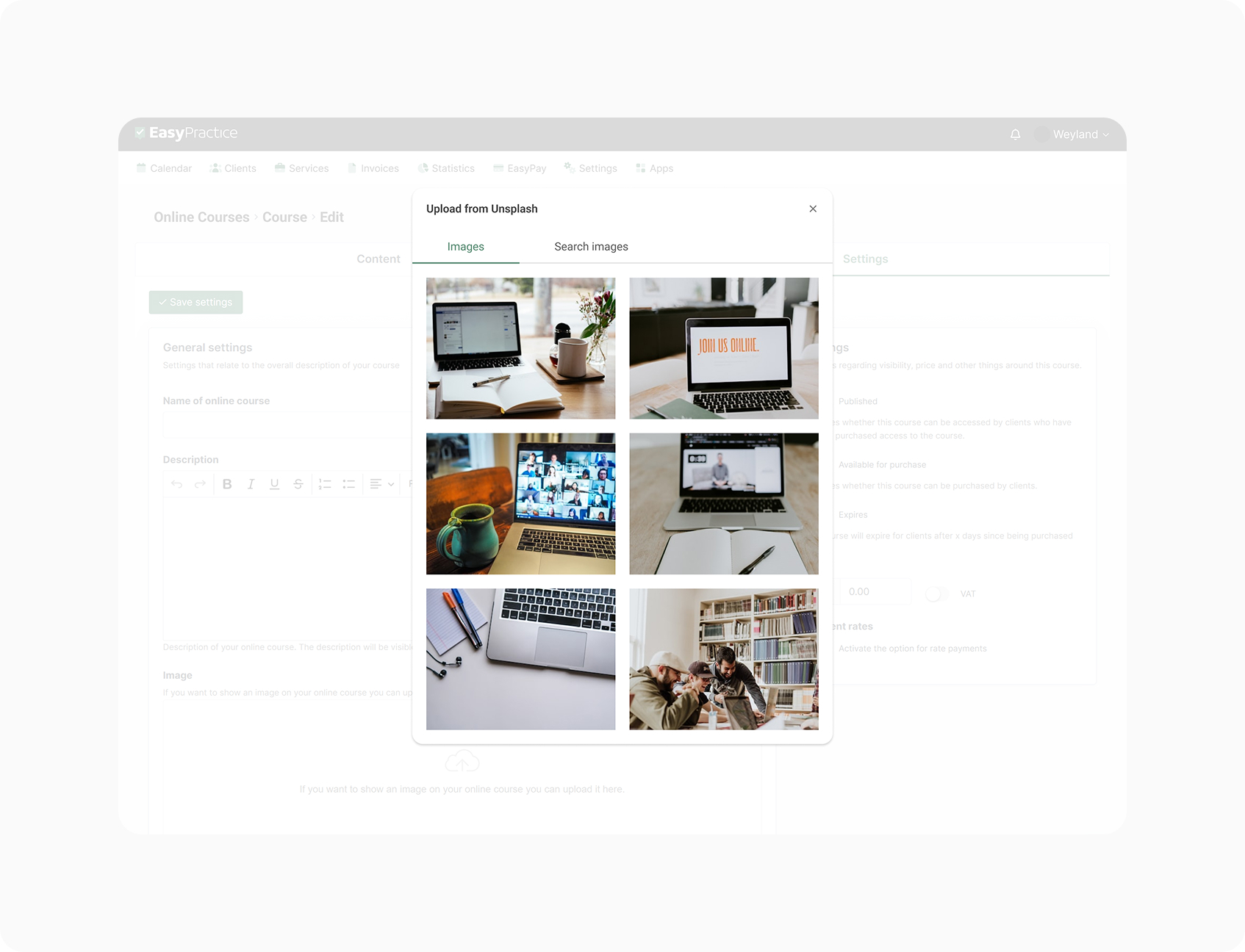 While doing Product Design at EasyPractice, I led the design and implementation of an integration with Unsplash to help therapists easily add high-quality, relevant images to various features within the application.